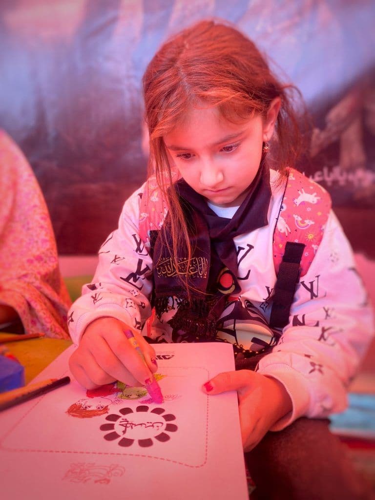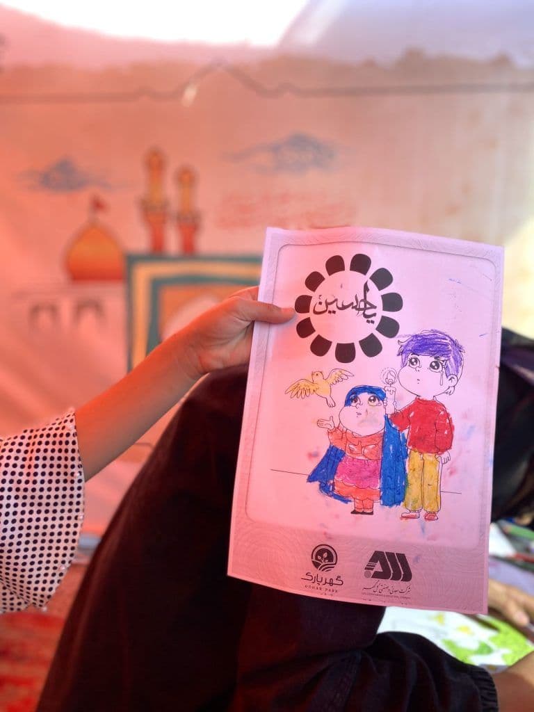 گذرِ کوتاهِ تصویری از غرفههای فرهنگی گهرپارک؛ پردهخوانی عاشورا و نقاشیکودک در روز اربعینحسینی، صحن مطهر امامزاده علی(ع) سیرجان
